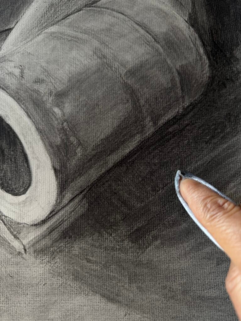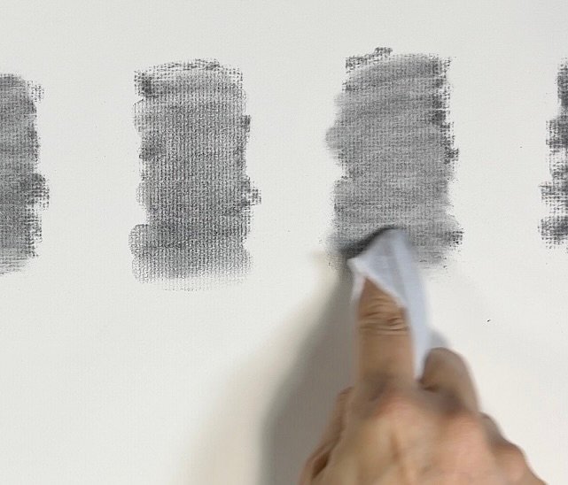 When using a cotton rag, remember that a clean area will lift or lighten the charcoal layer by picking up loose powder from the surface. This makes it perfect for softening edges, lightening transitions, or subtly adjusting highlights.