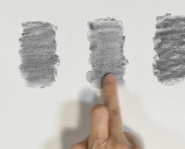 As you can see in the image below, the cotton rag produces the smoothest, most polished surface, while finger blending reveals the paper’s texture most prominently.