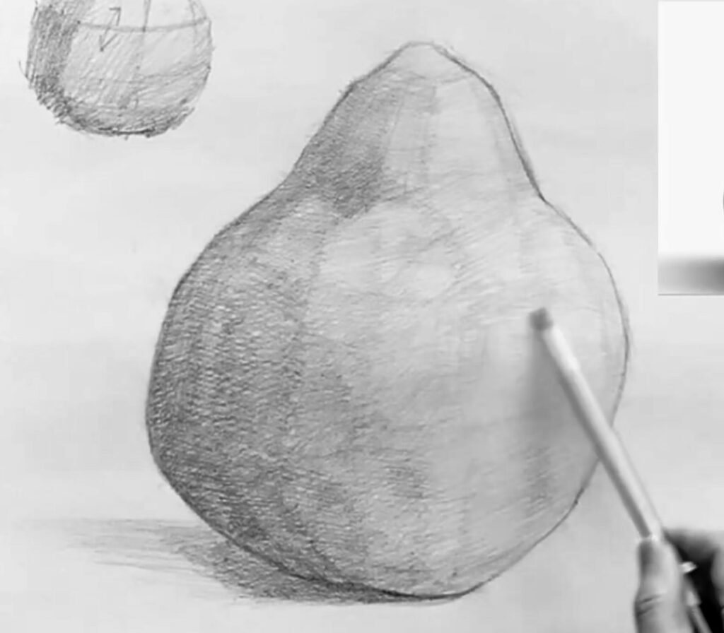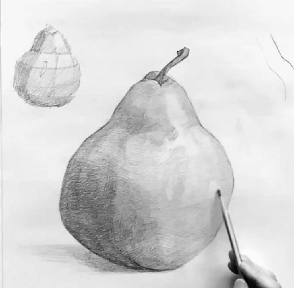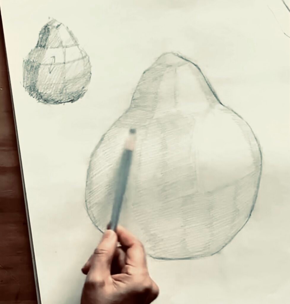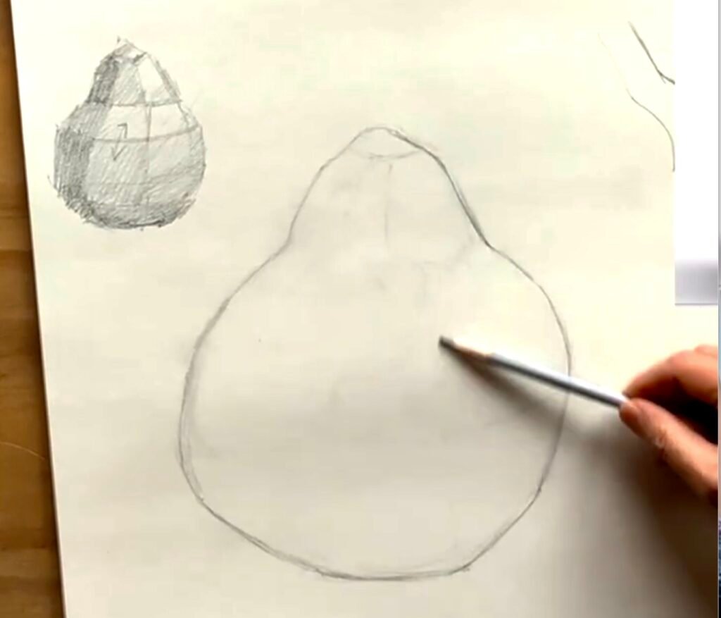After establishing the overall shape, begin constructing the pear as a three-dimensional form—as a solid mass, not just an outline. Separate light and shadow to establish structure, using simple, straight dividing lines to organize the form into simplified value zones or planes.
