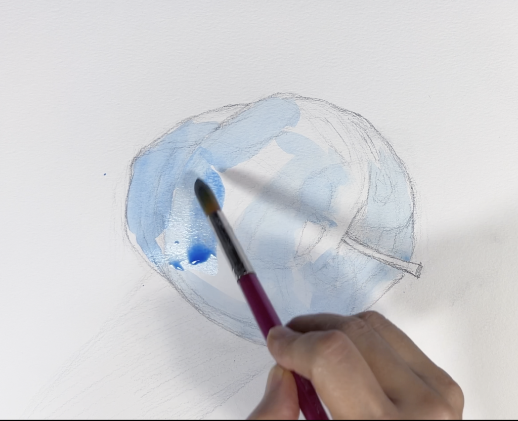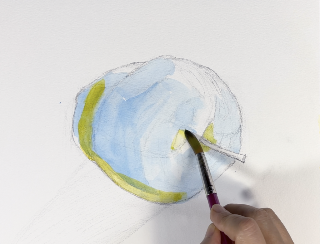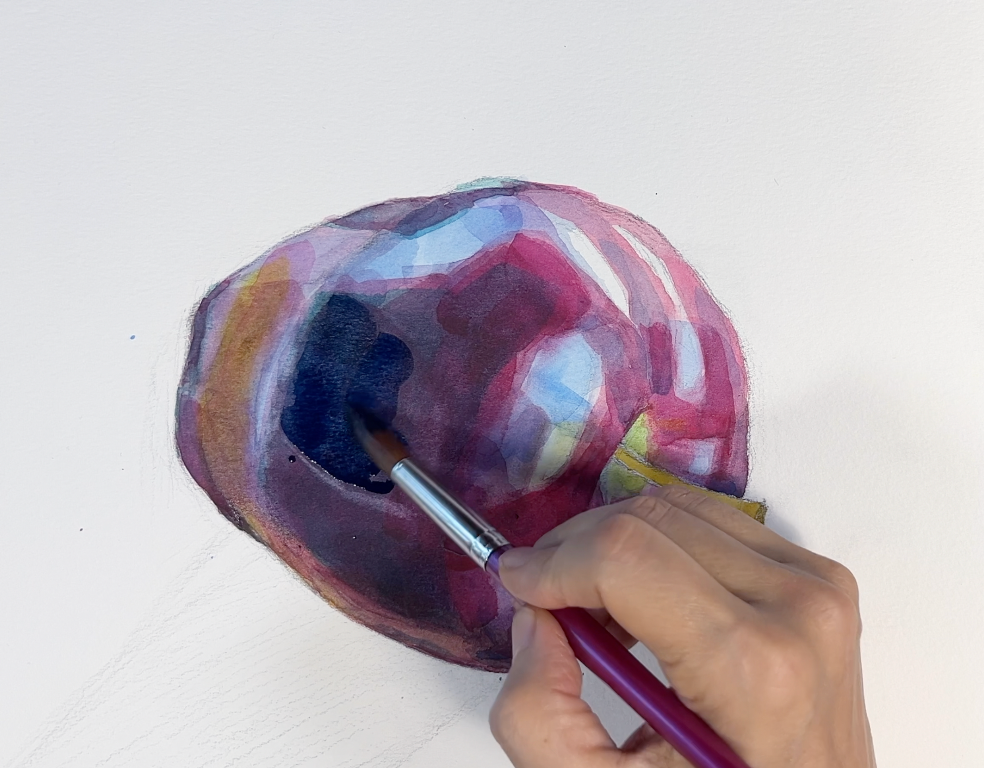 Darker glazes are placed only in the shadow areas, gradually increasing value to model the form; color temperature can be alternated, as in the demo, to emphasize transparency, though this is optional.