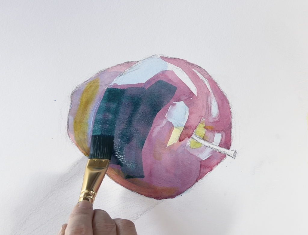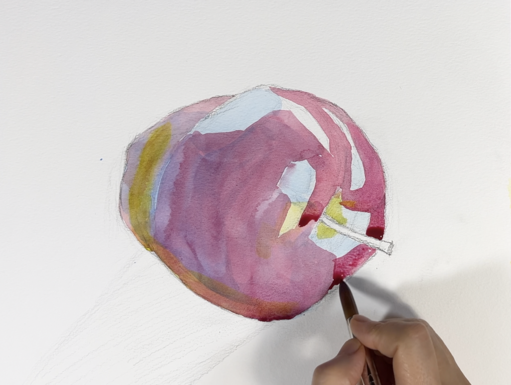 Many viewers have expressed interest in the watercolor glazing technique in the previous demonstration with a lemon, and for this demonstration I chose a single red apple as the subject. You can use the glazing method on its own or combine it with other watercolor techniques.