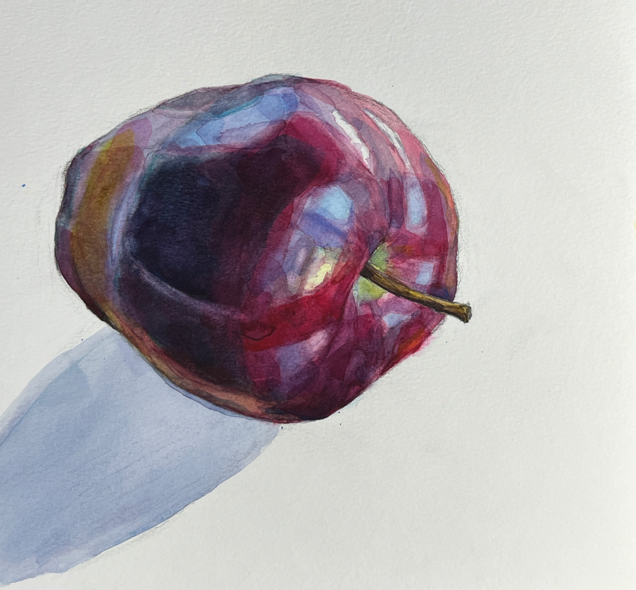 After the first layer has fully dried, I apply a second transparent glaze over the apple, deliberately avoiding the highlight so that it remains bright. Each glaze is applied with restraint and intention. With every new layer, I wait again for the paper to dry completely.